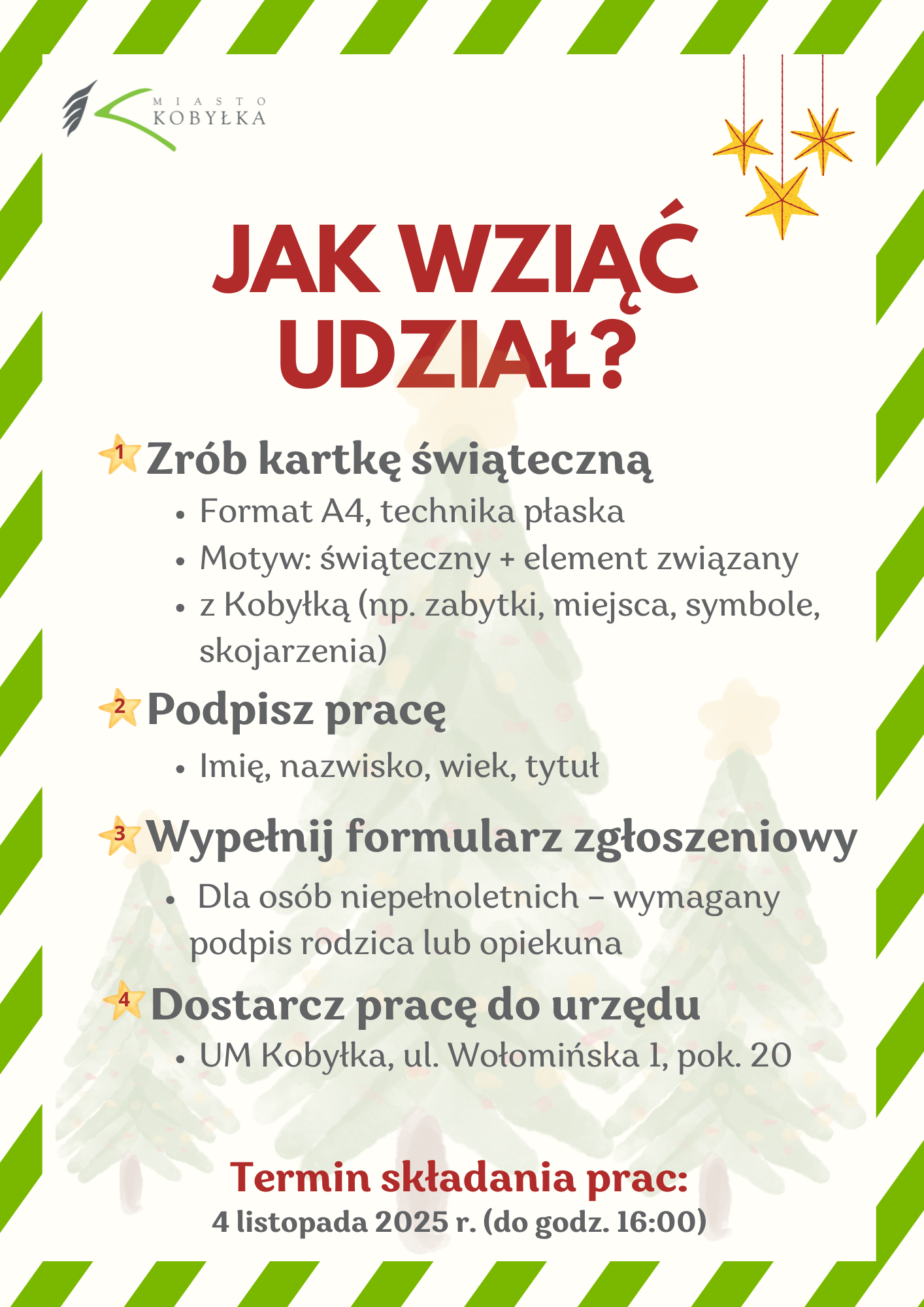 Zadaniem uczestników jest przygotowanie pracy plastycznej w formacie A4, nawiązującej do Świąt Bożego Narodzenia i jednocześnie przedstawiającej nasze miasto – Kobyłkę. Może to być lokalny akcent, miejsce historyczne, coś, co kojarzy się z miastem, lub jego fragment widziany oczami autora.