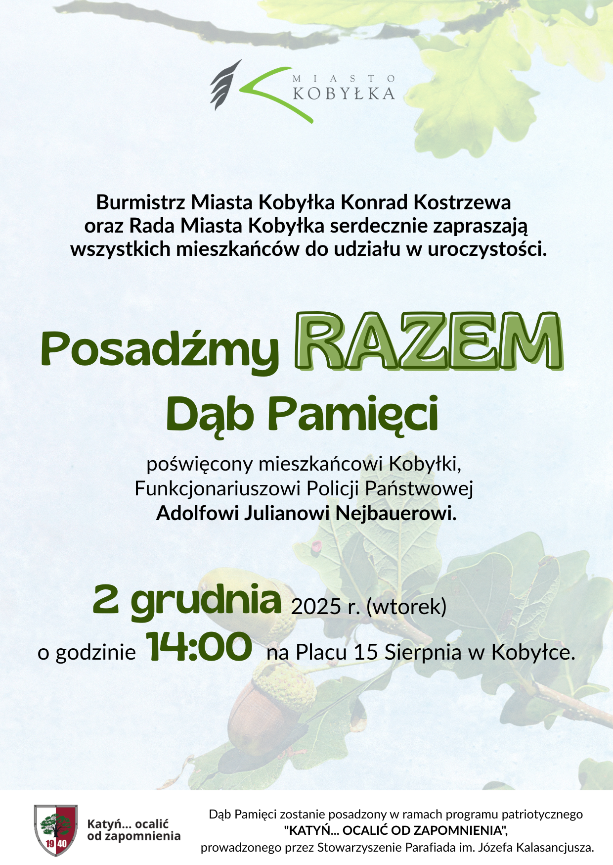 Burmistrz Miasta Kobyłka i Rada Miasta Kobyłka serdecznie zapraszają Mieszkańców na uroczystość posadzenia Dębu Pamięci poświęconego Aspirantowi Policji Państwowej Adolfowi Julianowi Nejbauerowi.