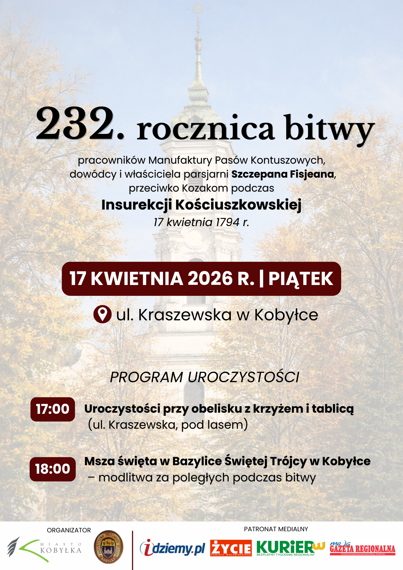 Już 17 kwietnia Kobyłka stanie się miejscem refleksji nad odwagą i determinacją tych, którzy 232 lata temu chwycili za broń. W 1794 roku, w czasie Insurekcji Kościuszkowskiej, doszło tu do starcia pomiędzy oddziałem złożonym z pracowników miejscowej manufaktury pasów kontuszowych, dowodzonych przez Szczepana Fisjeana, a wojskami kozackimi. Choć była to potyczka o charakterze lokalnym, jej znaczenie wykracza daleko poza granice miasta – stanowi bowiem symbol obywatelskiej postawy, odwagi i gotowości do poświęceń w imię wolności.