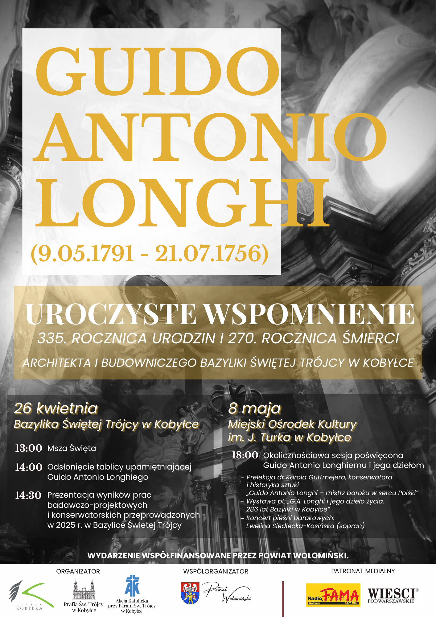 Mamy w Kobyłce postaci, które przez lata były zapomniane. Taką osobą jest Włoch Guido Antonio Longhi, urodzony we włoskim miasteczku Viggiu, który zapisał się na kartach kobyłkowskiej historii jako architekt i budowniczy Bazyliki św. Trójcy w Kobyłce. W roku 2026 r. przypada 335. rocznica urodzin i 270 rocznica śmierci artysty.